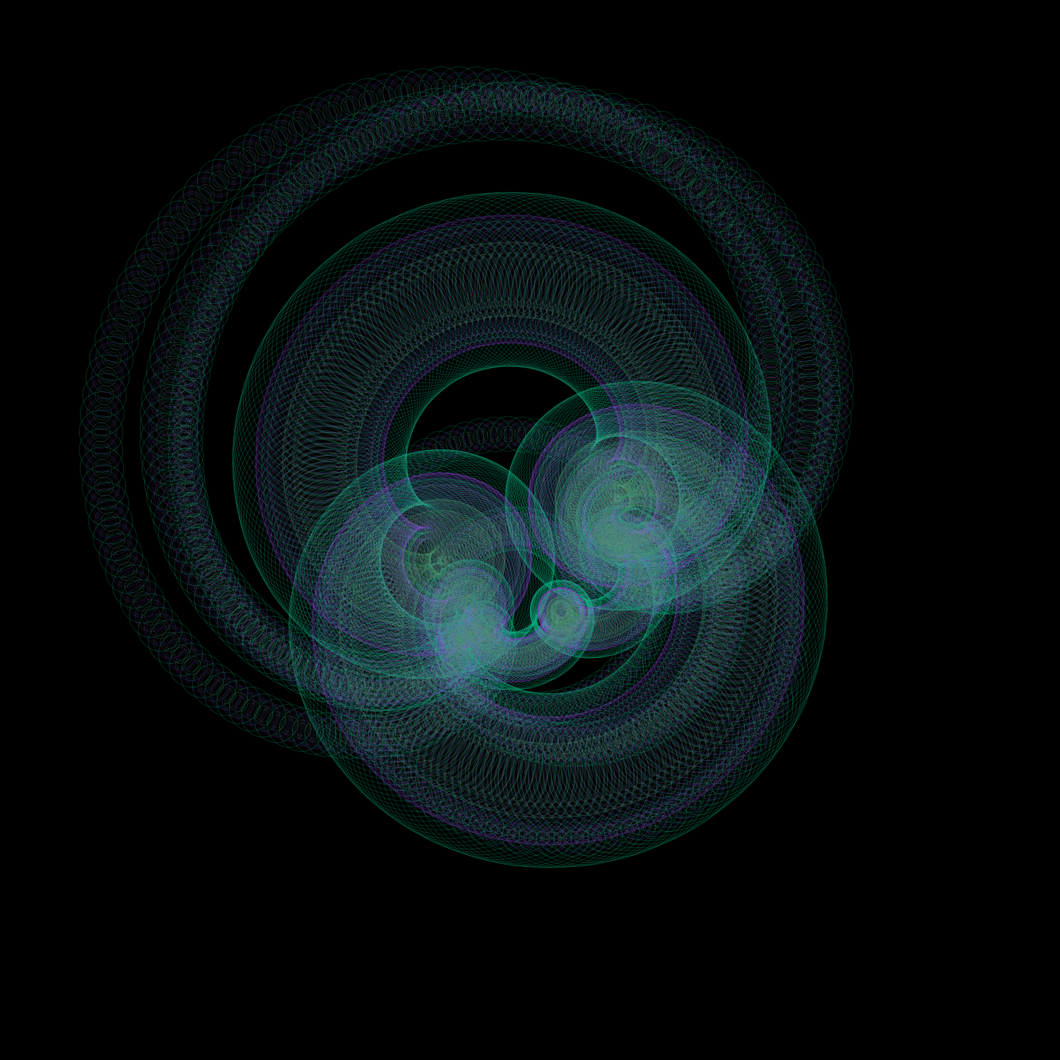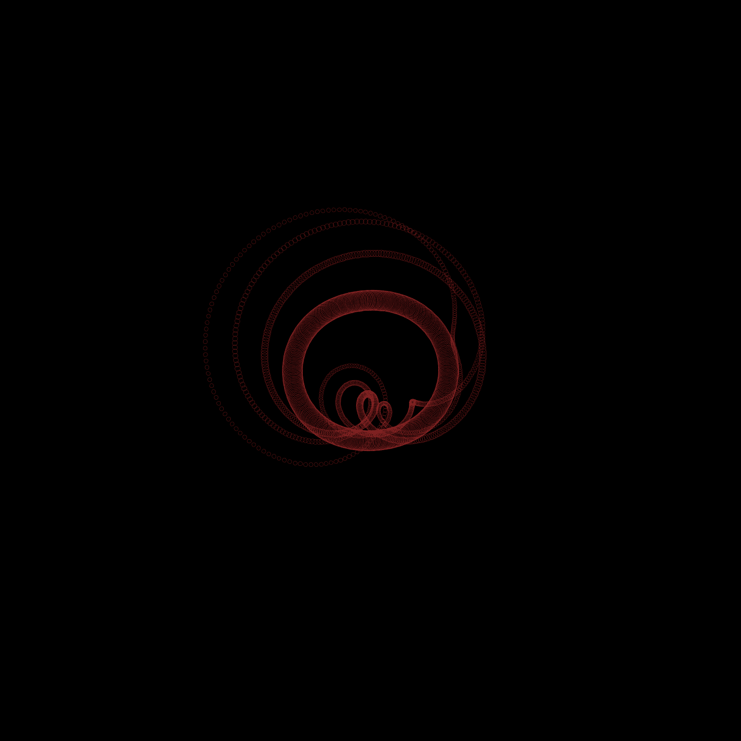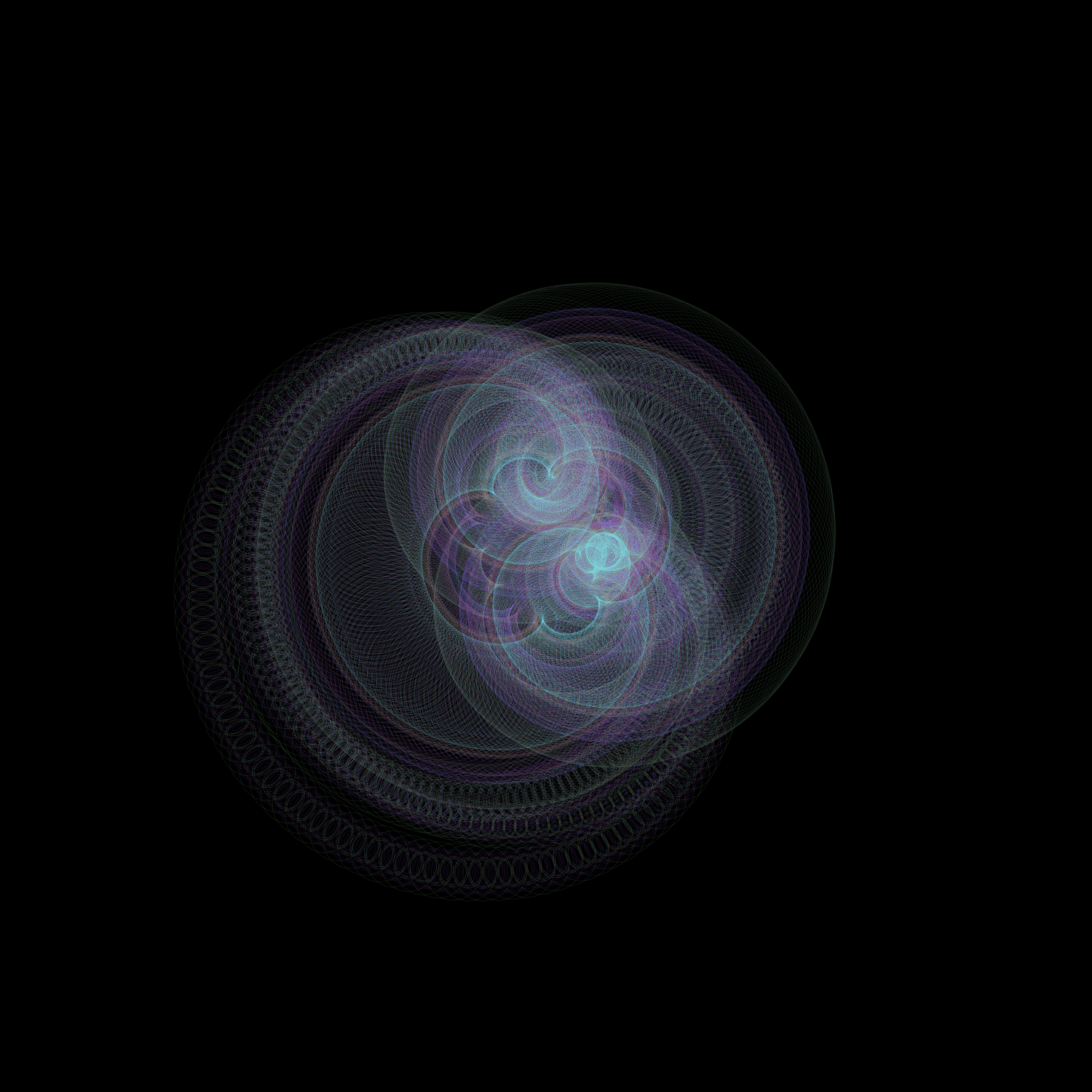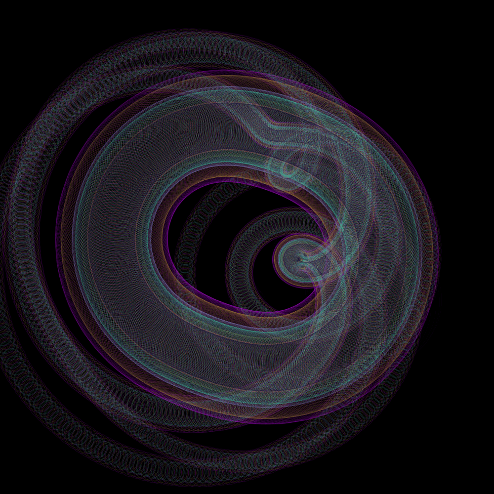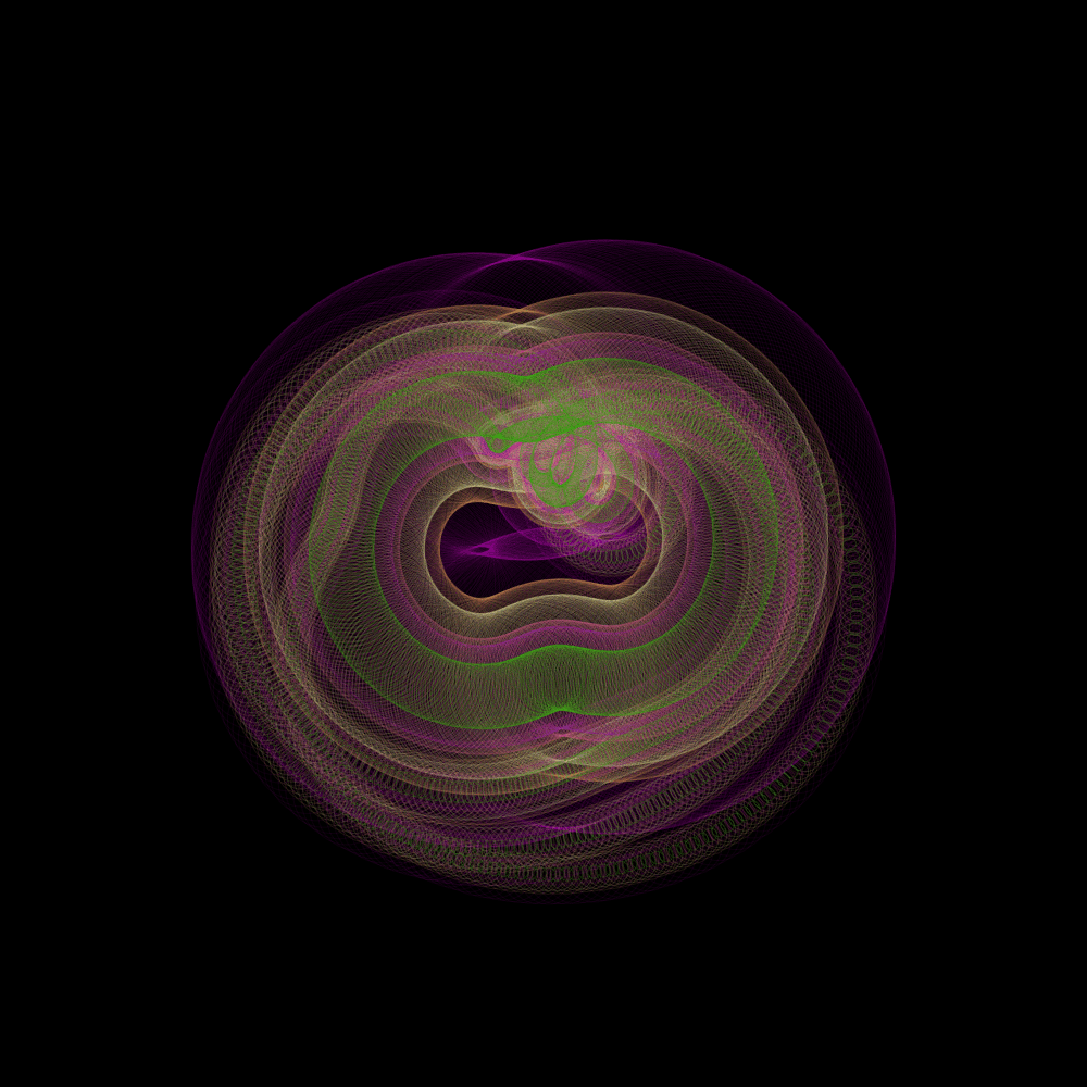 I love spirographs; there is something incredibly soothing and elegant about them. I decided to revist an old solar system sketch just to see what sort of incredible shapes and forms could come from it, and then fell in love all over again. It's simple, and it works well. How many times can you run a program before it starts feeling redundant? The answer's in the shape.