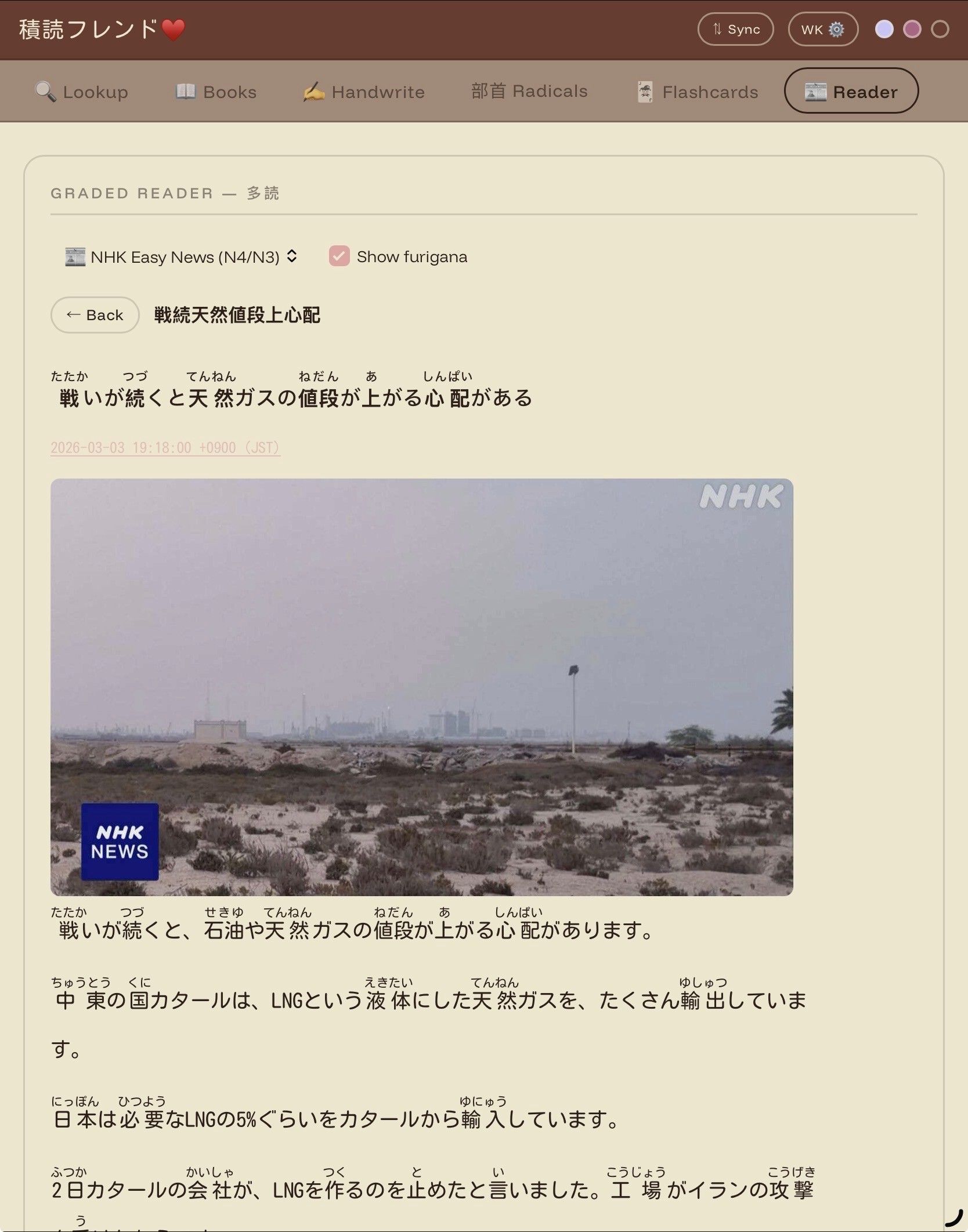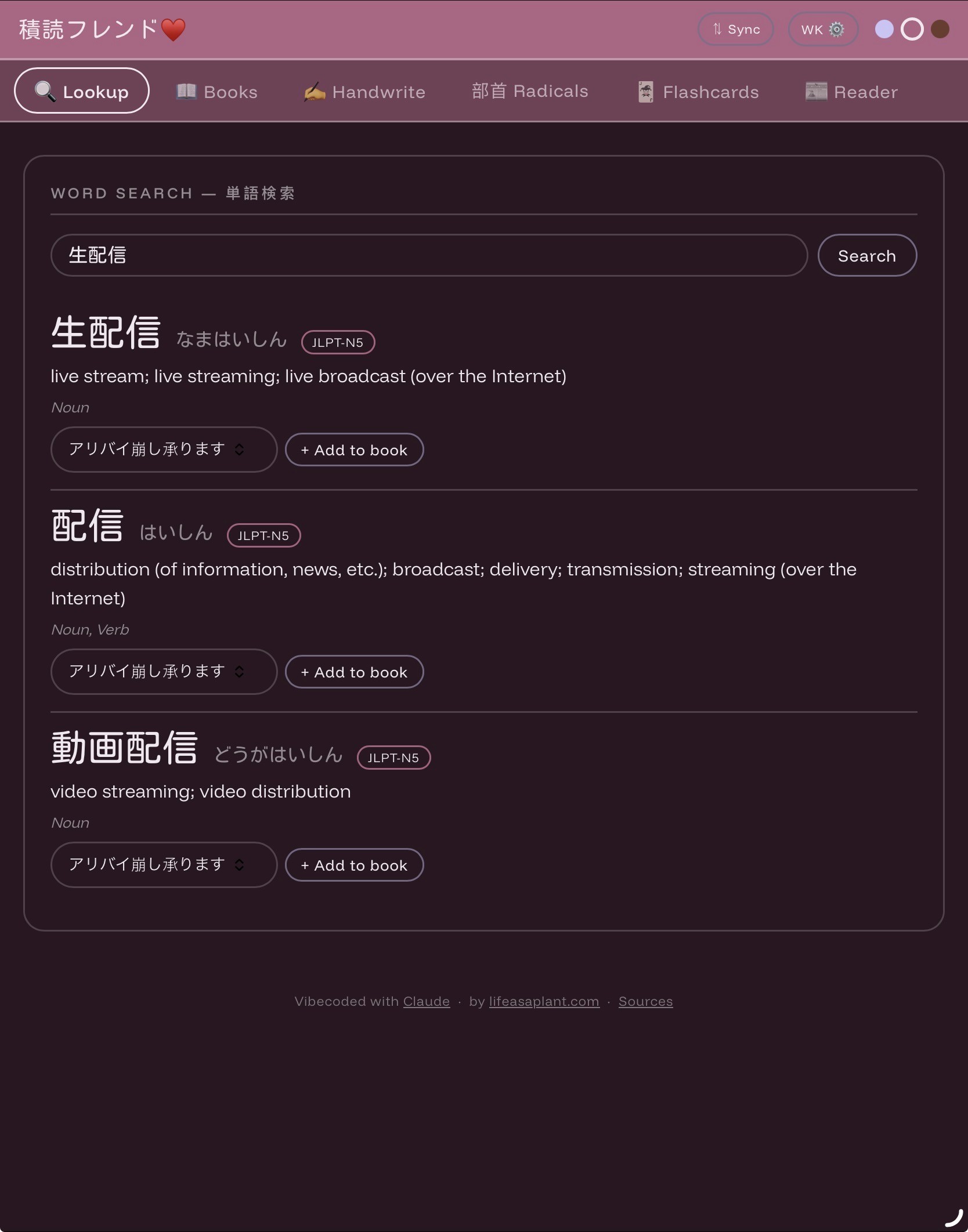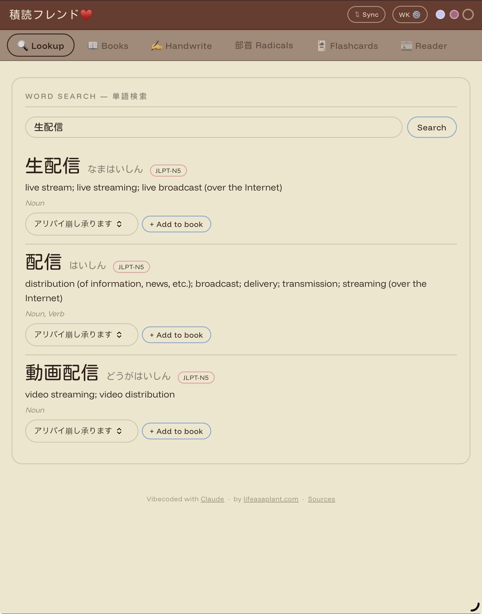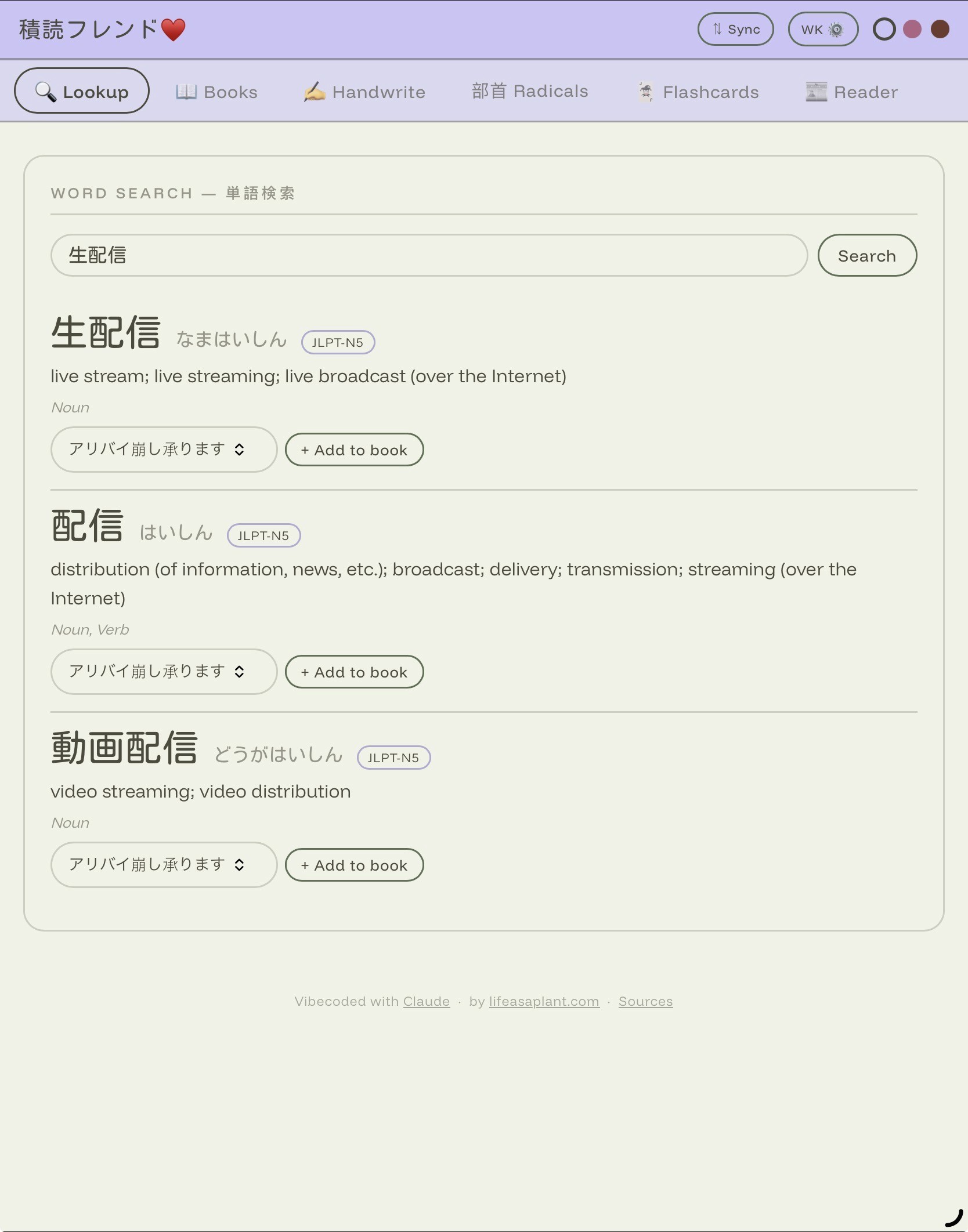 Tsundoku Friend is a fully browser-based Japanese study companion. You can track your reading with per-book vocabulary lists, look up words and save them directly to said lists, study flashcards, draw kanji for handwriting recognition, search by radical components, and read NHK Easy News articles with a furigana toggle, all without creating an account or installing anything.